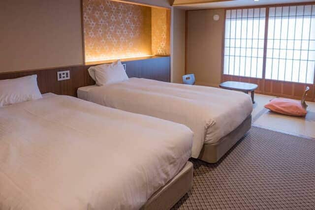 窓際が畳スペースになった和洋室の「スタンダードルームB」にはバルコニーがついています。スタンダードルームAは2名から3名、Bは2名から4名まで宿泊できる客室です。シモンズ社製のベッドは幅110cm × 長さ195cmが2台置かれています。