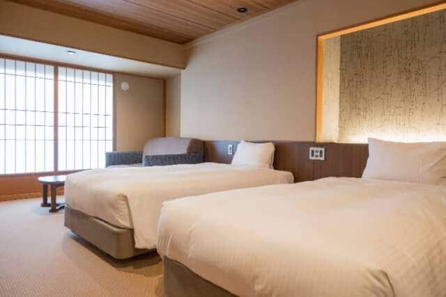 窓際にソファーが置かれた洋室で、2名から3名の客室です。シモンズ社製のベッドは幅110cm × 長さ195cmが2台置かれています。3名利用の場合はソファーベッドを利用します。