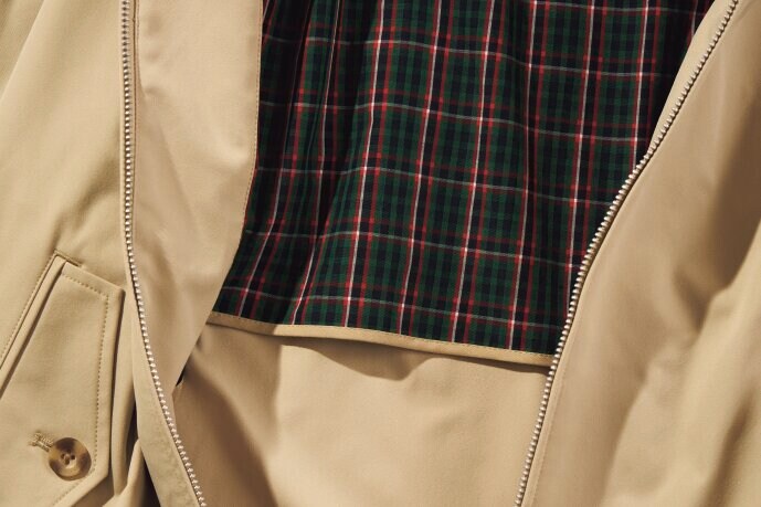コットンライクな肌触りだが、撥水性とストレッチ性を備えたポリエステル素材。袖裏にもポリエステルタフタを採用し、袖を通しやすくするなど細部にまで配慮がなされている。裏地はオリジナルのハウスチェック。半裏仕様のため軽快な羽織り心地。1万890円(コスギお客様相談室 TEL0120-298-454 https://goldenbearstore.jp)