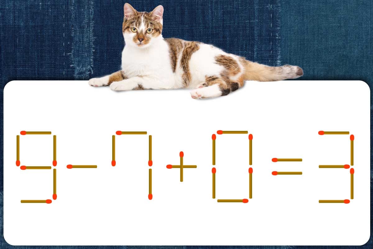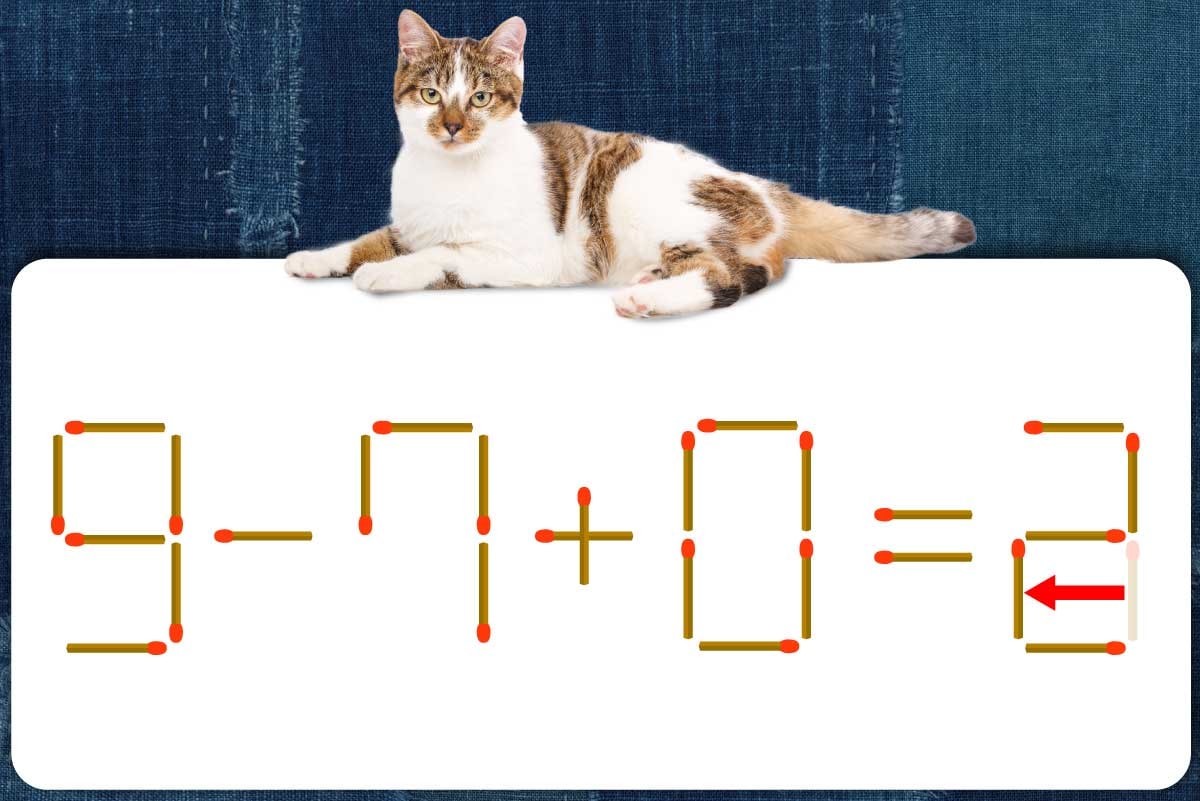 「3」のマッチ棒を1本移動させて「2」を作り、「9-7+0=2」にする。※解答は複数ある場合があります。