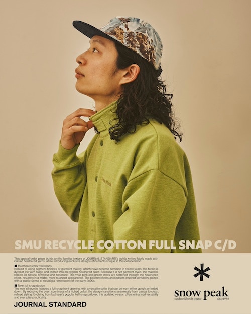 今回、JOURNAL STANDARD限定で展開されるSNOW PEAKとの別注シリーズは、裁断くずや不要衣類を再生する「UPCYCLE COTTON PROJECT」の思想を反映するなど、SNOW PEAKの代表的な素材使いや機能性をJOURNAL STANDARDのフィルターで再構築したシリーズ。