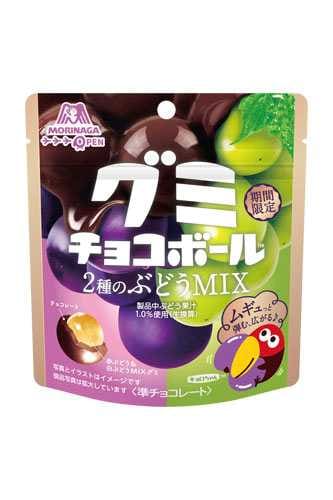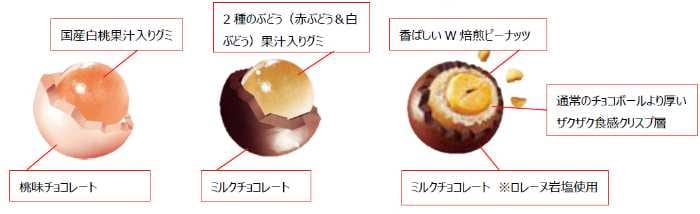 新発売となる「グミチョコボール<国産白桃>」「グミチョコボール<2種のぶどうMIX>」は、噛み応えのある果汁入りグミをチョコレートでコーティングした一粒。
