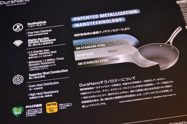 で、ステンレスをその他の金属と融合させることで、目に見えない小さな凹凸を作ることにより食材が接触する面積を少なくし、食材をこびりつきにくくしているのだとか。これはハスの葉が水滴を弾くロータス効果と同等の効果を金属加工することで実現しており、フライパンでは初めて応用される技術だそうです。