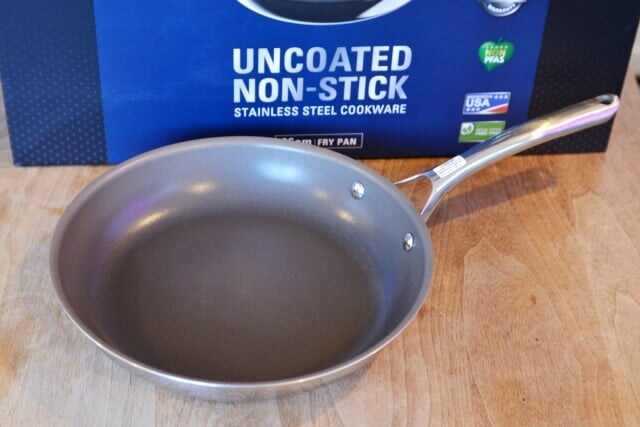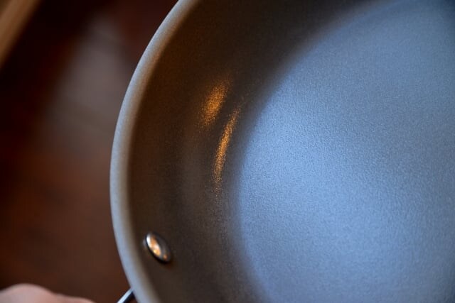 内面は、少々ザラッした手触り。フライパンの構造は、外側にステンレス鋼、中間層にアルミニウム、内面に超高温レーザーでチタン・ジルコニウム・セラミック粉末を融合加工したステンレスの3層となっています。