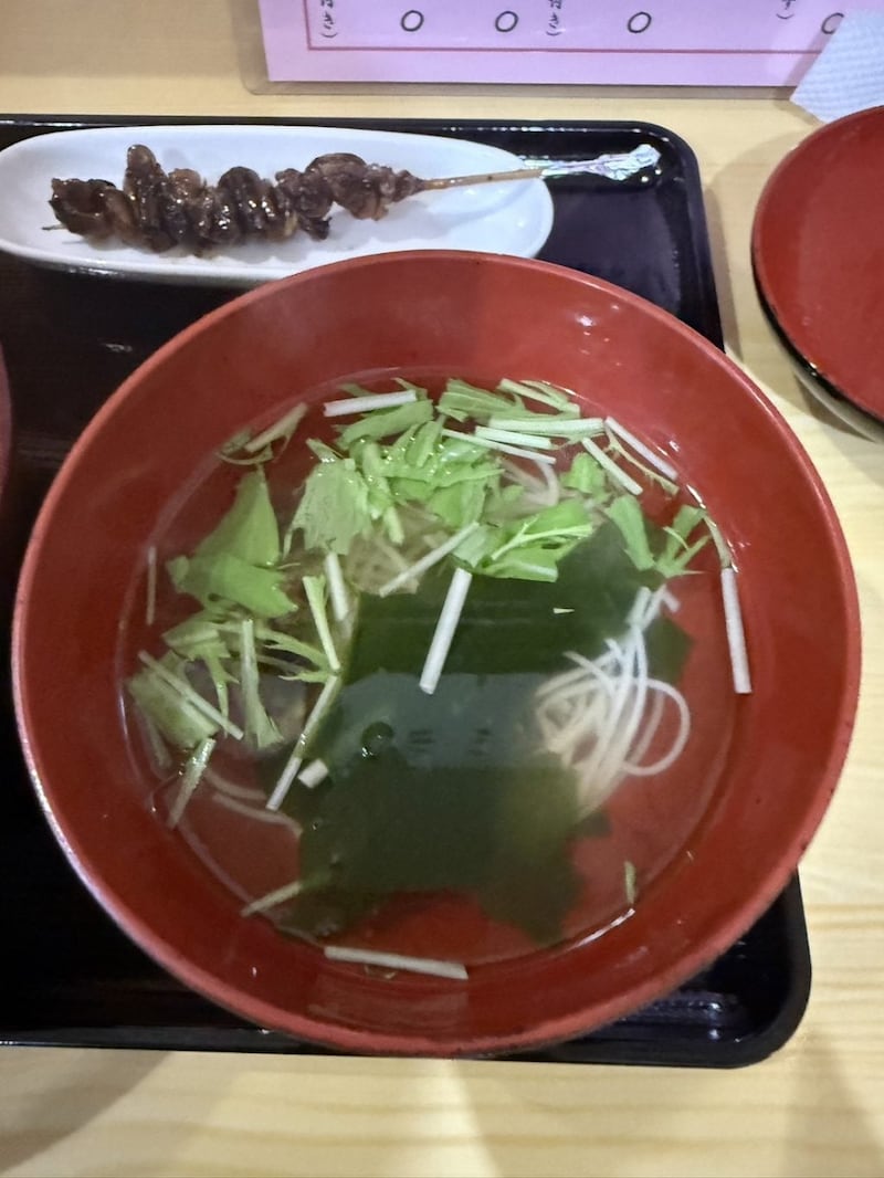 お吸い物とお漬物つき。肝串が1本230円だったのでこちらもいただくことに。