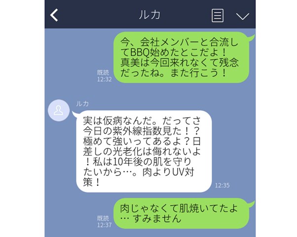 残念だなと思ってLINEを送ると、まさかの仮病宣告! 理由を聞くと、『今日の紫外線指数見た!? 光老化は侮れないよ。肉よりUV対策』というんです。