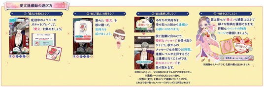 アプリをプレイして手に入る「愛文」を集めて彼に贈ると、彼との愛が深まり、彼と逢瀬に出かけることができるようになります。