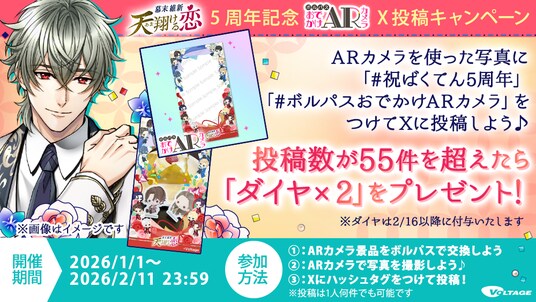 毎日の胸きゅんが貯まる!無料会員ポイントサイト「VOLTAGEパスポート」(以下、「ボルパス」)では、「幕天」5周年を記念して、応援キャンペーンおよびX投稿キャンペーンを開催しております。
