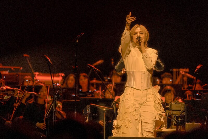 「ようこそお越しいただき、ありがとうございます」と挨拶し、「夢にまでみたオーケストラコンサート。初めての大切な瞬間を、皆さんと大切に過ごしていきたいと(タイトルに)Momentsとつけさせていただきました」とこの日への想いを語り、「君がいるから次の扉を開いていける、そんな曲です」と告げて、憂いをのせた「Key to My Heart」へ。そして「深い深い、海の中の物語をお聴きいただこうと思います」と告げて続いたのは、遠く響くホルンの音とユニゾンした蒼井の深い歌声から始まり、オリエンタルなメロディーが物語を紡ぐ「Endless Song」。蒼井とオケに降り注ぐ青いライトと透き通ったハイトーンファルセットが、幻想を作り上げた。次に届けたのはピアノと弦楽が別れの哀しみに満ちた歌声に寄り添う「spilt memories」。静かに続く感動が、心を揺さぶった。