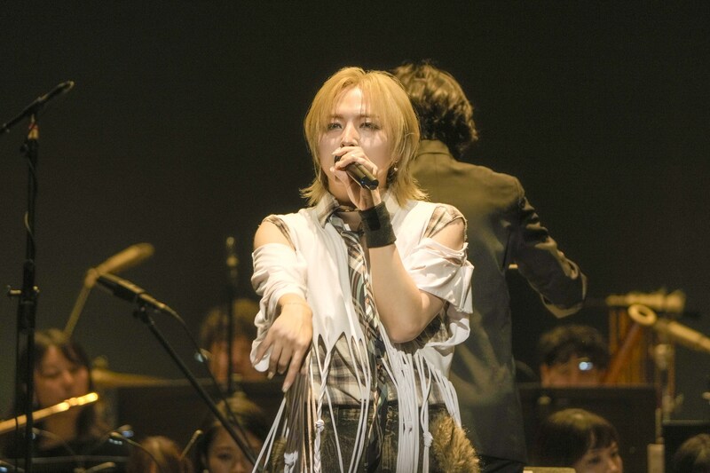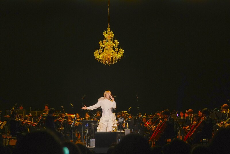 榊真由がオーケストラをセクションごとに労って満場の拍手を浴びる中、カジュアルな衣装に着替えた蒼井が、「アンコールありがとうございます」と再びステージへ。「ここから何曲か歌わせていただきたいんですけど……激しい曲なんですよ」と笑って、もう一度スタンディングを促して、拳を振り上げ放ったのは「FALL」。頭上のシャンデリアがリズムに合わせて点滅し、蒼井がくるくると回ってアクション。突き刺すようなボーカルと鋭いギターが鳴り響き、オーディエンスの「Hi!Hi!」の掛け声が速度を増して、続く「零」でも炸裂。パワフルな歌声にオーケストラの壮大なサウンドが絡み合い、大きく弾けた。