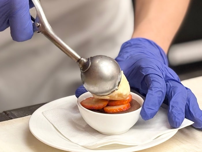 出来たてのスイーツを提供するライブステーションのメニューでは、温かいフォンダンショコラに果実味溢れるストロベリーコンポートを重ね、バニラアイスクリームをのせて仕上げる「あたたかいチョコレートケーキ バニラアイスクリームストロベリー」が登場。