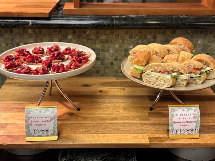 ボリューム満点な「ソーセージとモッツァレラのサンドイッチ」や「いちごとビーツのブルスケッタ」は、ワインやシャンパンとも相性抜群!