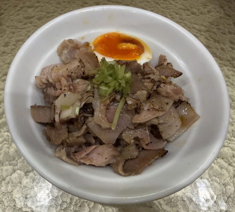 お先に運ばれてきた炙りチャーシュー丼。香ばしいお肉と一緒にご飯をひとくち食べると、ラーメンへの期待が高まる。