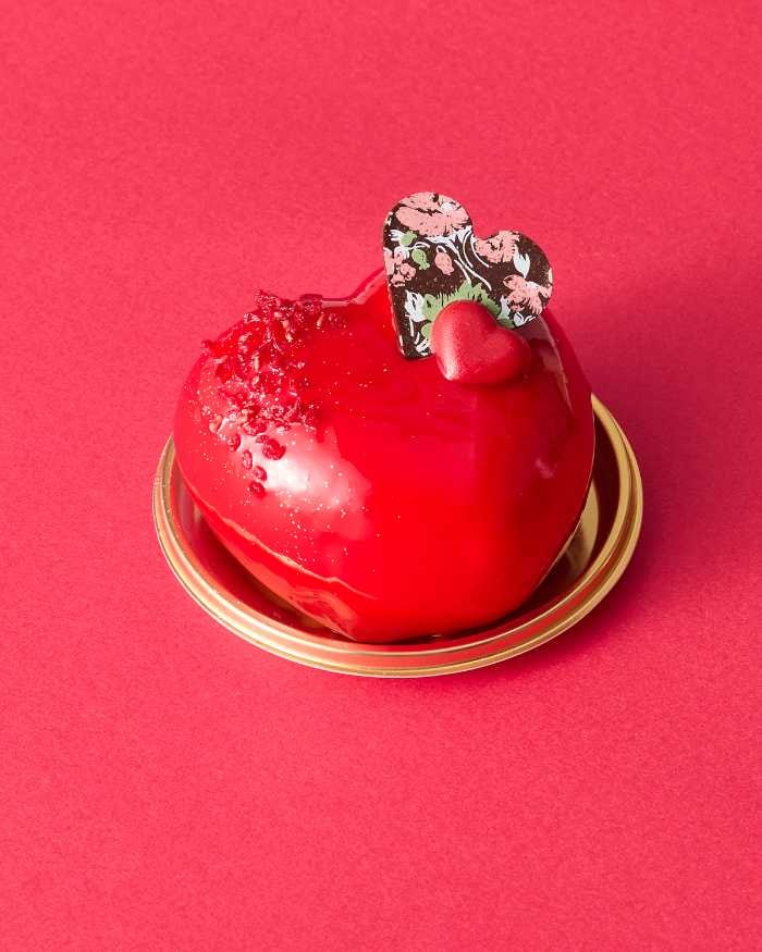 フレーズピスターシュは、真紅のグラサージュが目を惹くハート型の苺ムースケーキ。