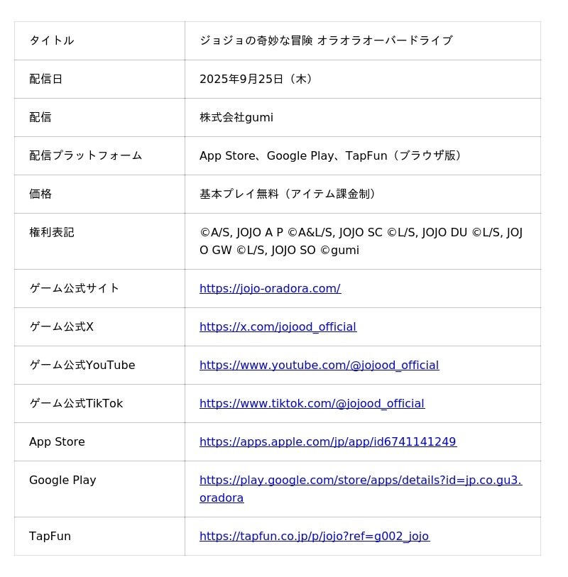 株式会社gumi(本社:東京都新宿区、代表取締役社長:川本 寛之)は、アプリゲーム『ジョジョの奇妙な冒険 オラオラオーバードライブ』のブラウザ版(PC&スマホ)を本日2026年1月19日にTapFunにて配信を開始したことをお知らせいたします。