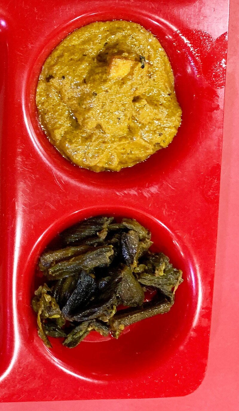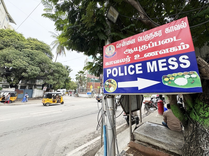 ポリス食堂はチェンナイ警察本部の敷地内にあります。敷地内には警察官の寮があり、警察官だけでなく、その家族も住んでいる。まずはじめに、ライスと根菜カレー、漬物、パパド(インド式せんべい)、ゆで卵が盛られた皿を渡される。