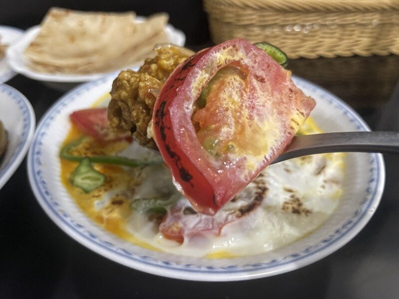 ナンはプラス100円でチーズクルチャ(チーズナン)に変更可能。ちょっと待って。たった100円でチーズクルチャにできるなんてお得すぎる。普通300円くらい追加する必要があるのに、良心的すぎる価格設定。嬉しい。