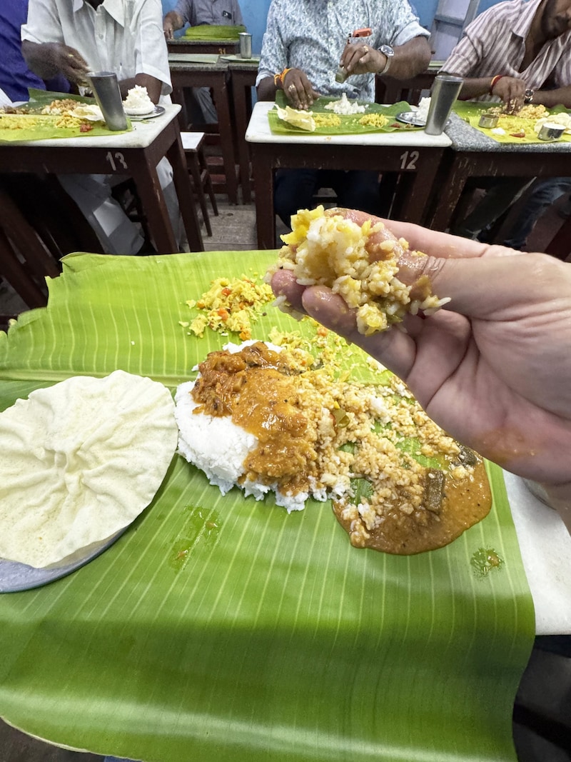 素手で食べるの手洗いは必須。素手で食べるのだが、意外と熱い。少しずつ冷やしながら食べる。うまい、うますぎる。過剰な味付けはされておらず、かなり繊細で食材の旨味を生かした仕上がり。この素朴さがヤミツキになる。たまらない。「Kasi Vinayaga Mess」(No 5, 58/2, Akbar Sahib St, Police Quarters, Triplicane, Chennai, Tamil Nadu India)。