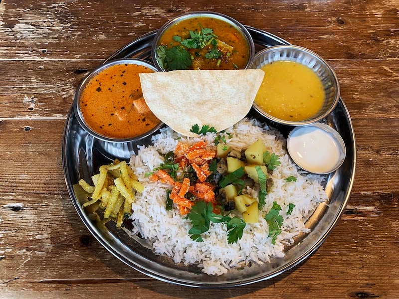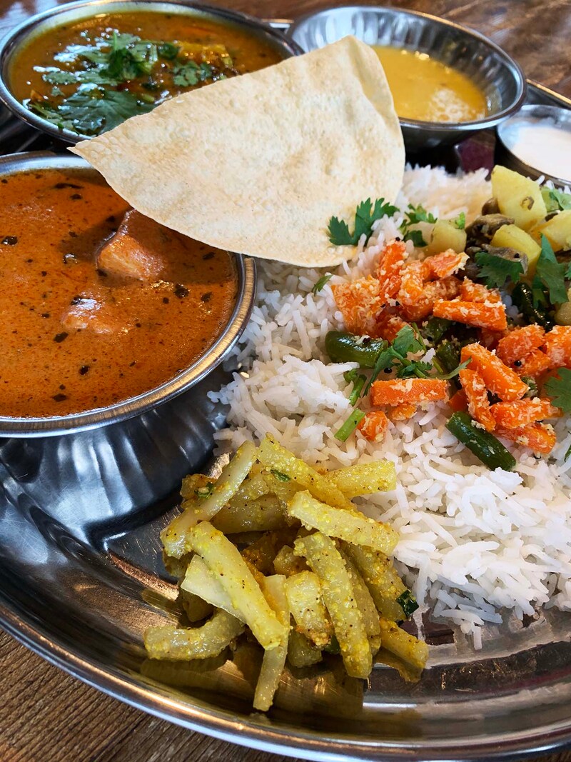 インデアンターリーはカレー3種類、ナン、サフランライス、パパドがセットになっている。カレーはポークチリキーマカレー、家庭料理風フイッシュカレー、豆とほうれん草カレー、バターチキンカレーから3つ選べる。