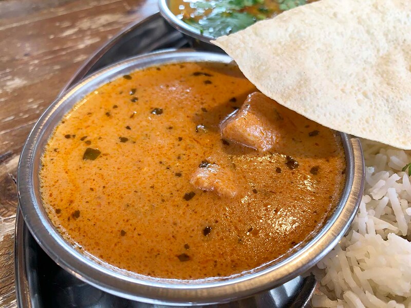 ナンはないが南インド料理としては定番のドーサかバトゥーラ(揚げナン)からパンを選ぶことができ、どちらを選んだとしても生地の香ばしさがカレーのスパイスの旨味を盛り上げて絶品。もし興味がわいたならば、カレーとカレーを混ぜて生地を浸して食べてみてほしい。