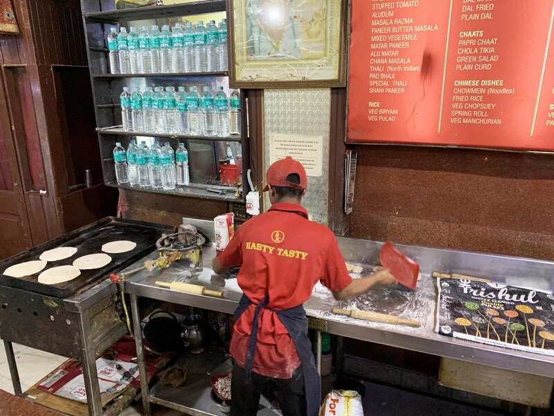 ファストフード的だけど、店員さんがしっかりチャパティやパラタが手作りだった。チャパティを手に持つと、めっちゃ熱い。いま焼いたばかりで、焼いて1分経ってないと思われる。でもこのチャパティ、油がジュワ~とジューシー。チャパティってカラッとしててパサパサしてる点が魅力だが、ここは違う。