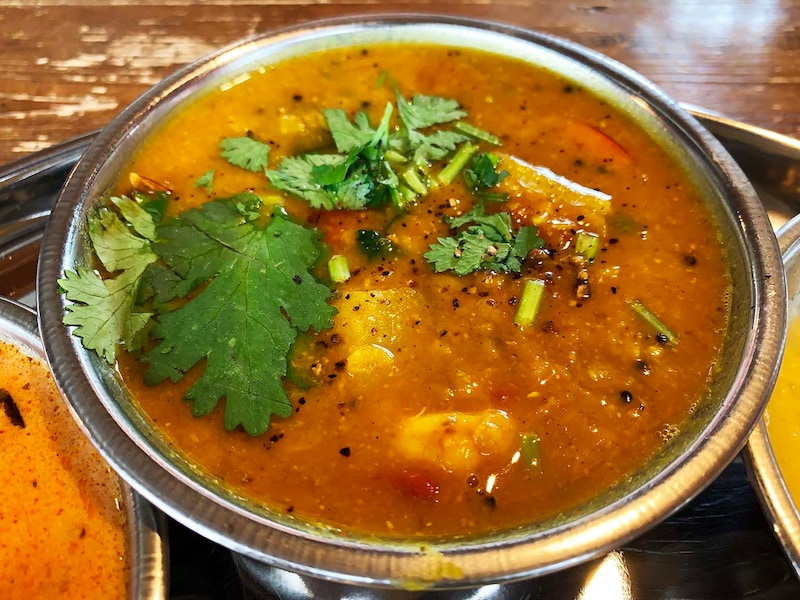 カレーが三種類ついてくるが、ラッサムやスパイシーなスープのサンバルも他のカレーとミックスして食べてみるのも楽しい。あくまで私見だが、南インドで食べるインドカレーよりも旨味が深いと感じたのは気のせいだろうか。スパイスが食材から旨味と甘味を引き出しているようにも感じた。「三燈舎」(東京都千代田区神田小川町3-2)。