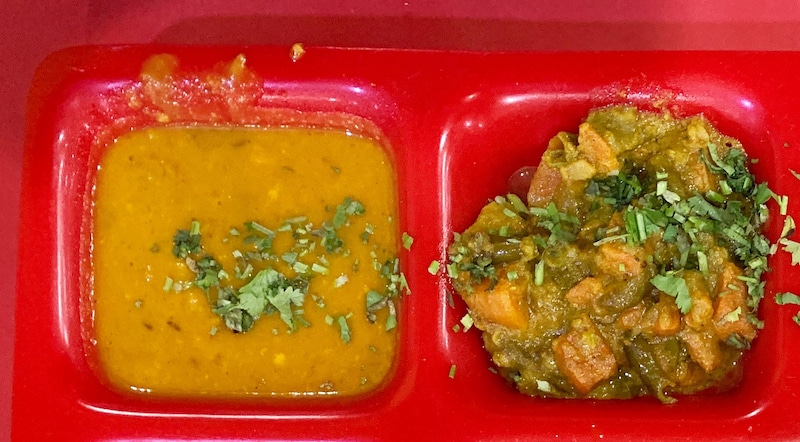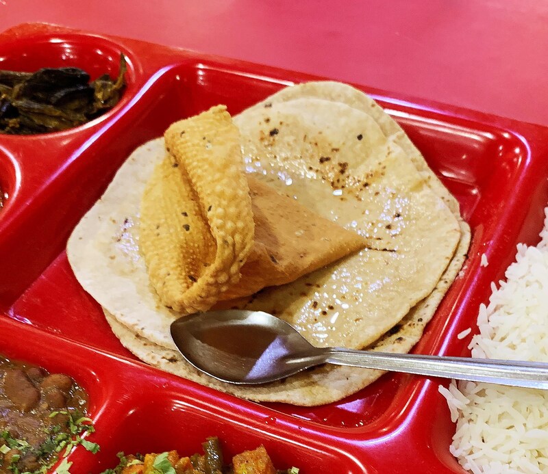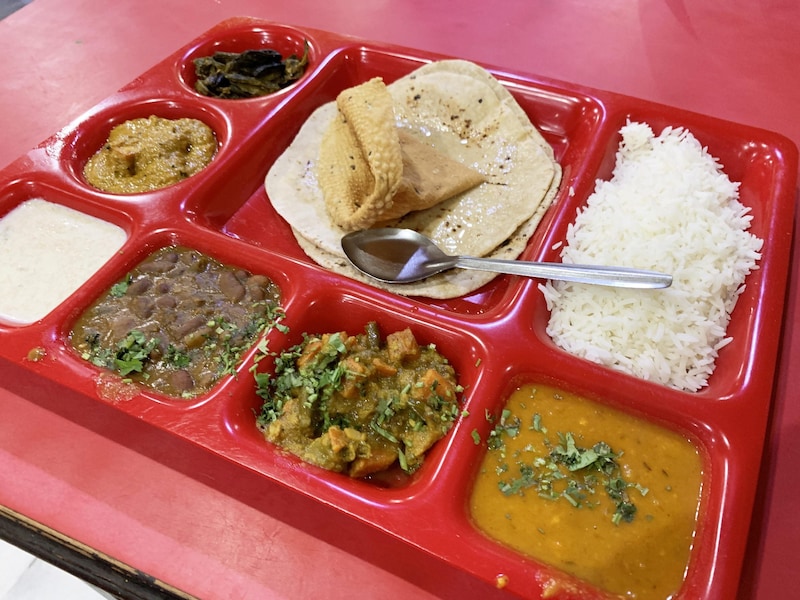 インドパンはいろいろな種類が用意されているが、今回はパロタをオーダー。そこに豆カレーや野菜カレー、スープなどが盛られる。食べ放題なので、どんどんカレーが出てきた。パンも「いらない」と言うまで追加される。この店に来て満腹にならない人はいない。