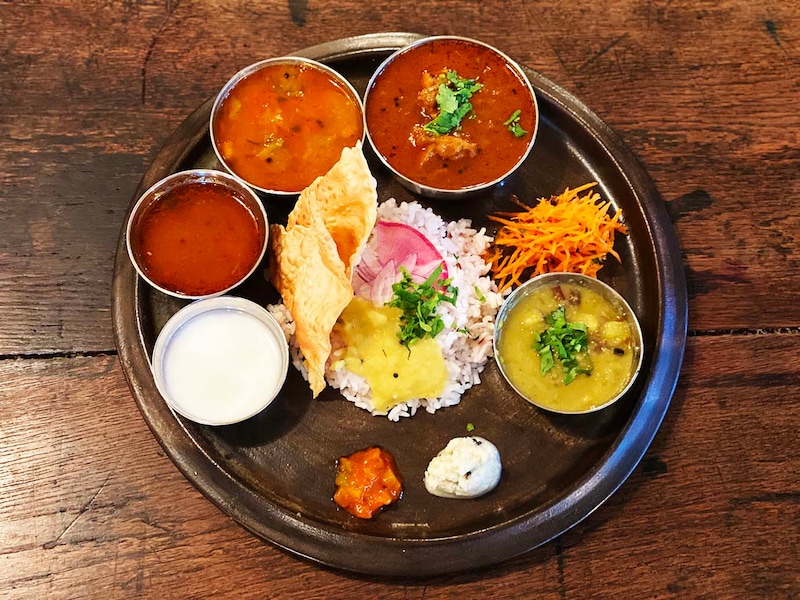 民家っぽい店舗の横道から庭に行き、庭で靴を脱いでから、縁側から入る。まさかの縁側イン。民家っぽく、庭があり、縁側もある。確実に民家的。ミールスをオーダー。さまざまなカレーや総菜がセットになったもの。サンバル、ラッサム、カレー、ポリヤル、ダルフライ、アチャール、チャトニ、バスマティライス、パパドがひとつの皿に盛られている。実においしそうなスパイスの薫りを放っている。丁寧に作っている感がハンパない。カオスに盛られているようで、極めて丁寧に、気を使って盛られている。もはやアート。