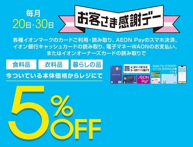 毎月20日・30日はイオンの「お客さま感謝デー」です。食料品・衣料品・暮らしの品が、レジで5%オフになります。