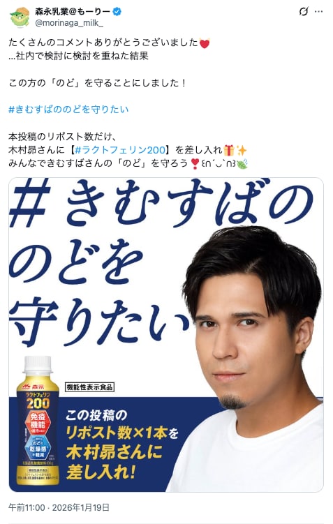 森永乳業は、X(旧Twitter)上でのファンの応援が“そのまま差し入れ”として声優・木村昴さん本人に届く参加型キャンペーン「#きむすばののどを守りたい」を、2026年1月19日より開始しました。