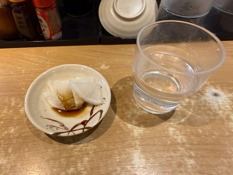 入店して席に着くと、お冷の他に大根の漬物が。鹿児島のラーメン店ではおなじみのサービス、なくなったお店もあるが、これがあるとやはり嬉しい。甘い醤油をちょこっとかけてポリポリといただく。