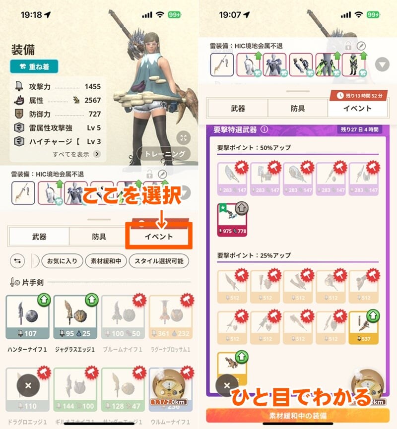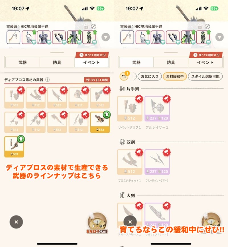 それに合わせて“イベント”という項目の最下部、さらに“素材緩和中”の項目にディアブロスの素材で生産強化できる武器がピックアップされている。