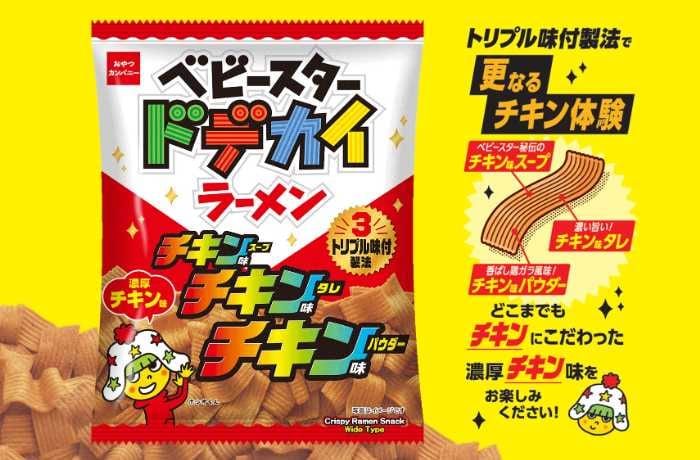 ベビースタードデカイラーメン(チキンチキンチキン濃厚チキン味)は、スープ・タレ・パウダーすべてにチキンの旨みを重ねた特別仕様。