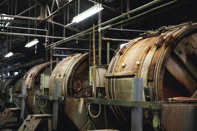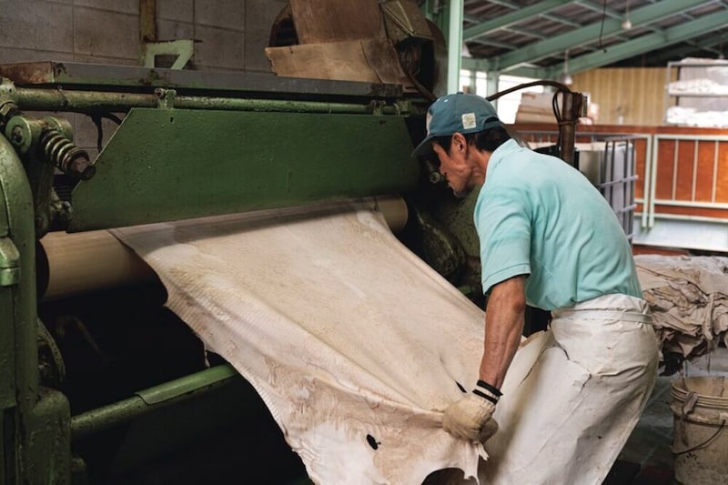 鞣し工程前の皮をキレイにする下処理は、なんと60年間使っている機械で行っている。下処理を丁寧に行うことで美しい革へと生まれ変わる。