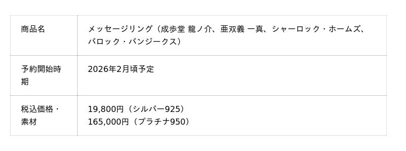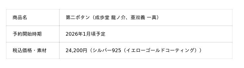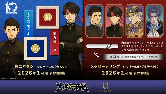 株式会社ユートレジャー(本社:東京都新宿区、代表取締役社長:青木 興一、株式会社ケイ・ウノの連結子会社)は、2025年7月9日で10周年を迎えた「大逆転裁判」シリーズとコラボレーションした「第二ボタン」「メッセージリング(指輪)」の予約受け付けを2026年1・2月頃に順次行います。ユートレジャーでは初めての取り扱いライセンスとなります。