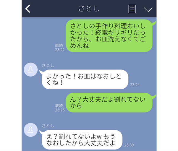 「関西出身の彼と付き合い始めた頃のLINEです。彼の家で手作り料理をご馳走になって、洗い物をせずに帰ってしまったので『お皿を洗えなくてごめん』と送りました。