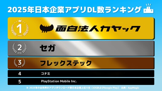 株式会社カヤック(本社:神奈川県鎌倉市、代表取締役 CEO:柳澤 大輔、東証グロース3904、以下カヤック)は、米国のモバイルアプリデータプラットフォーム「AppMagic」が集計した2025年の世界アプリダウンロード数(iOSおよびGoogle Play)において、日本企業として1位を獲得したことをお知らせいたします(※1)。これにより、カヤックは2021年より5年連続のアプリダウンロード数1位(※3)獲得となります。