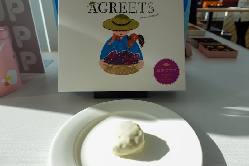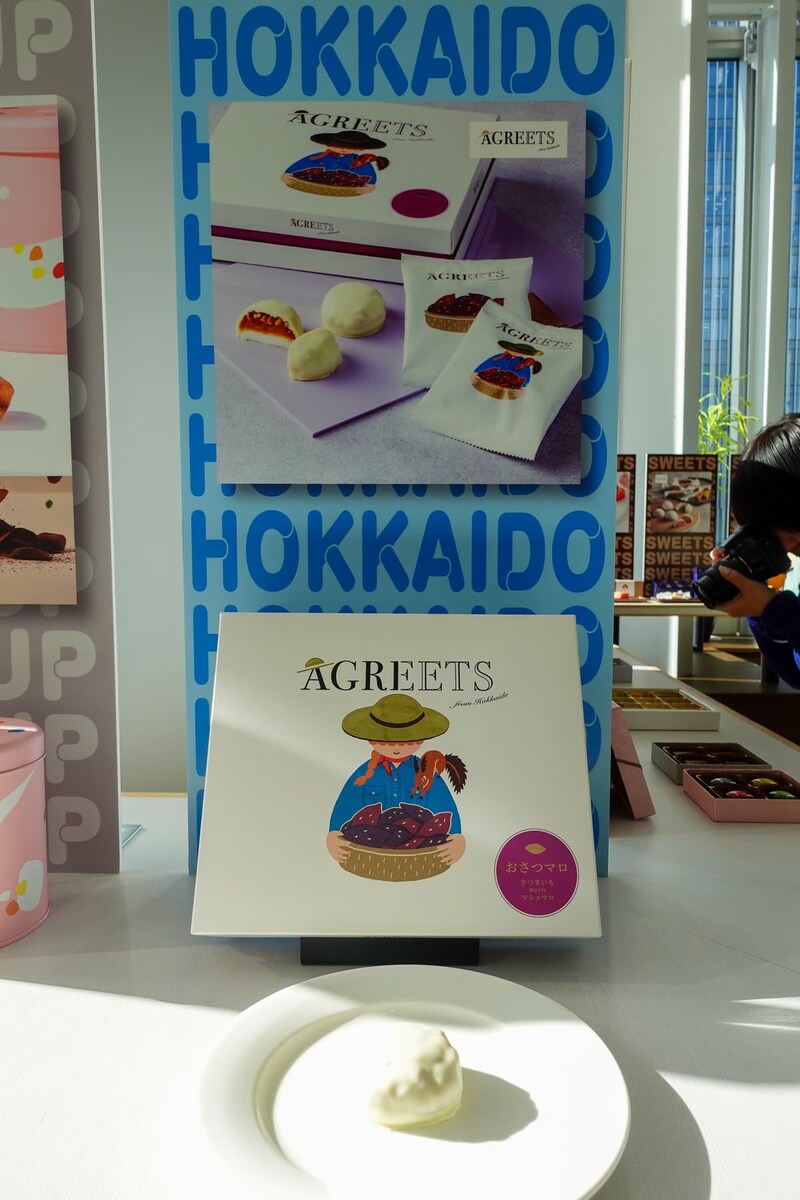 2025年10月に北海道でデビューし、大阪初上陸となるブランドが「アグリーツ」。“北のグルメハンター”と呼ばれる大丸松坂屋百貨店・本田大助氏が、白い恋人で有名な「ISHIYA」とコラボしたスイーツブランドです。かわいらしいパッケージが目を引く「おさつマロ」は、北海道産さつまいも「由栗いも」の餡をマシュマロと合わせ、アーモンドと共にホワイトチョコレートで包んだスイーツ。さつまいもの甘みとアーモンドのカリッとした食感、コクあるホワイトチョコレートのマリアージュが堪能できます。