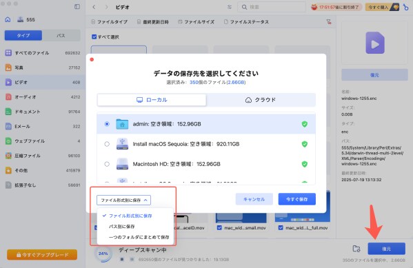 ステップ3.復元したファイルの保存場所を選択して、MacローカルまたはGoogleドライブに保存します。