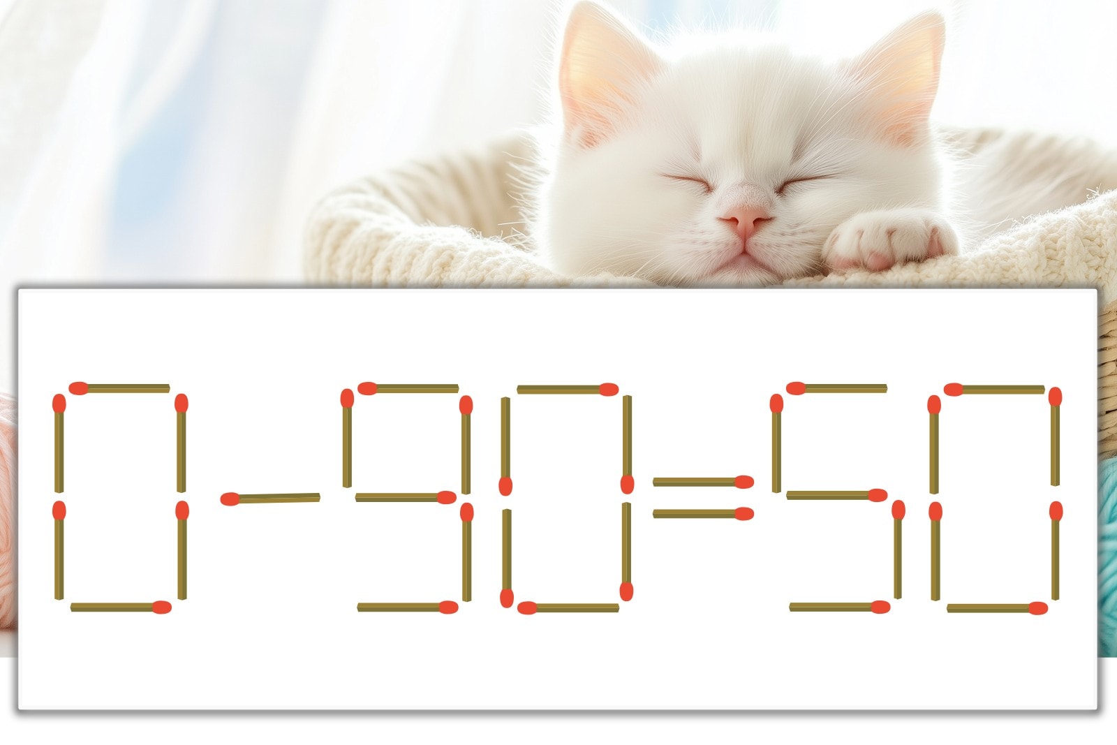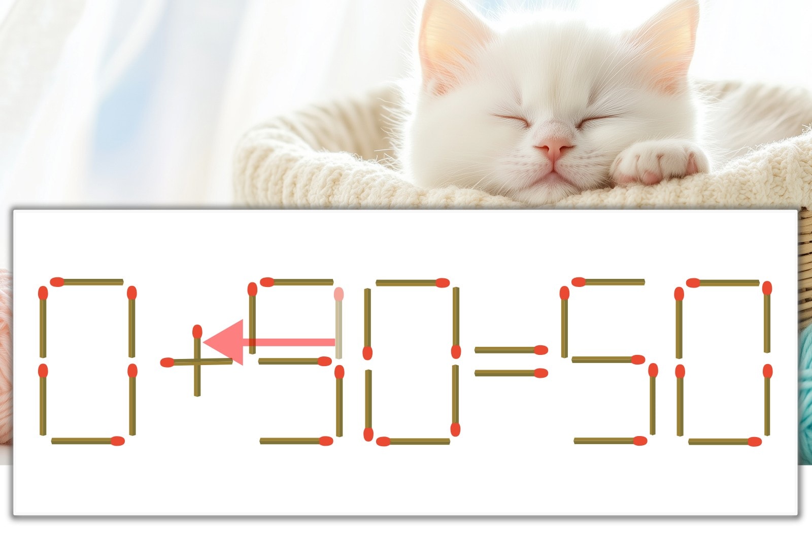 「9」を別の数字に変化させると答えが導き出せます。「9」のマッチ棒を1本移動して、「-」を「+」にしてみましょう。すると、「0+50=50」が成立します。