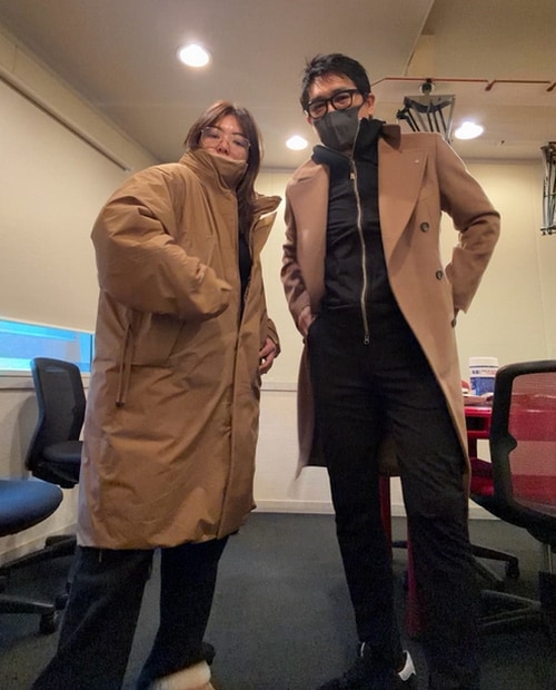続けて「なんと!偶然!!」「こんなことあるのか!!」と驚きを隠せない様子でつづり、収録現場で顔を合わせた2人は、偶然にも色味やテイストが近いリンクコーデだったという。高橋がブラウンのロングコートに黒のインナーとパンツ、黒縁メガネを合わせた落ち着いた“大人シック”な装い、一方の野呂は、同じくブラウン系のダウンコートに眼鏡、黒のトップスにパンツを合わせたカジュアルながらも温かみのあるスタイルを披露している。