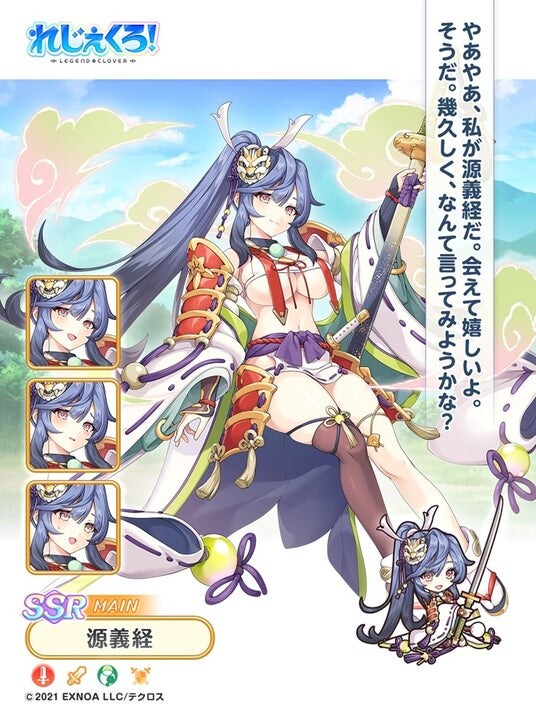 合同会社EXNOA(本社:東京都港区、CEO:東條 寛、URL:https://games.dmm.com/)が運営するDMM GAMESにおいて、真の英雄となる王道ファンタジー『れじぇくろ!~レジェンド・クローバー~』(https://www.legend-clover.net/)にて、1月20日から新たなレジェンドとして「静御前」「源義経」が登場!さらに彼女たちが活躍するイベント「彼方の記憶と真実の絆」も開催!