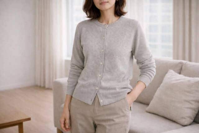 体温調整がしやすく、日常でも仕事でも活躍する定番アイテム・カーディガン。ただ、年齢を重ねるほど「なんとなく羽織っているだけ」で、全体が野暮ったく見えてしまうことも少なくありません。実はその印象差を生んでいるのが、“前の開け方”のバランス。ほんの少し着方を変えるだけで、同じカーディガンでも洗練度は大きく変わります。