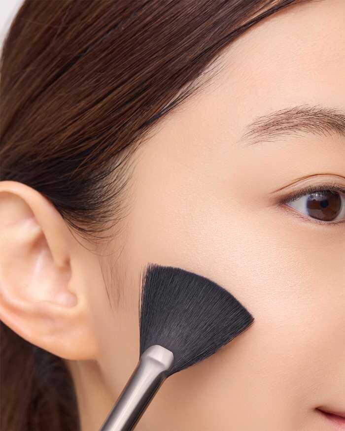 扇形フォルムで頬骨や鼻筋、鎖骨までフィットし、光を置く位置を直感的にコントロール。外出先でのメイク直しにも活躍する一本です。