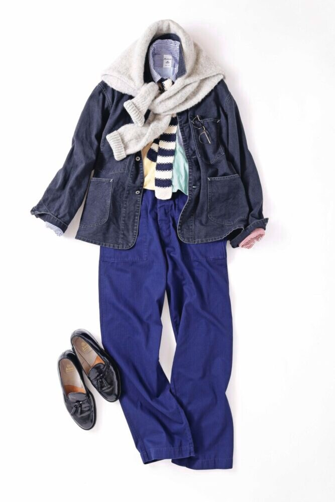 吉村 いつもならベージュのチノパンツにしたと思いますが、今回はシャツがキャッチーなので、全体を馴染ませる意味でネイビーにしました。ダークネイビーより、この浅いカラーリングのネイビーパンツが、色のバランス的にすごくしっくりきたんです。柔らかめの生地感も武骨なダック地と相性がよく、ほどよいカジュアル感のまま全体のトーンを落とせました。