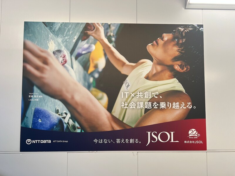 株式会社JSOL(ジェイソル)は、ブランドメッセージであるこの言葉に込めた想いを多くの人に知ってもらいたいという考えから、スポーツクライミングの安楽宙斗選手を起用した交通広告を東京・大阪・名古屋の主要駅で展開しています。