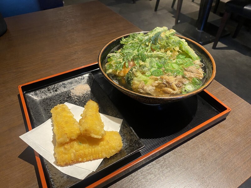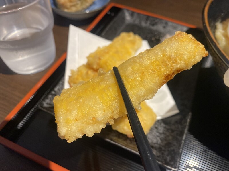 それプラス、筆者は一味をかけるのも、とうもろこし天の甘さや脂と良い塩梅が取れておすすめです。