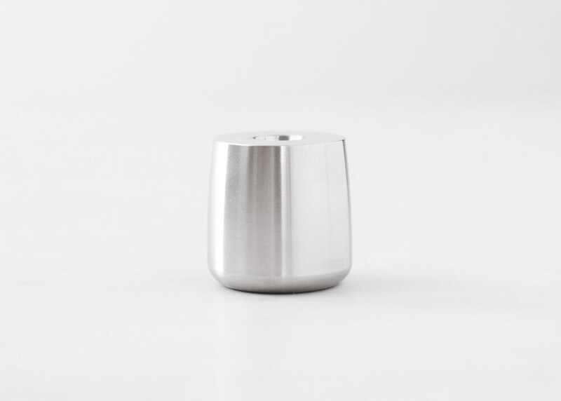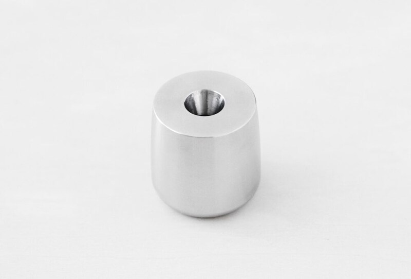 ステンレススチールの無垢材をNC旋盤で削り出し、3cm四方に収まるコンパクトなサイズながら、確かな重量感を実現。ペン立てとしてはもちろん、ペーパーウェイトとしても使用できる。