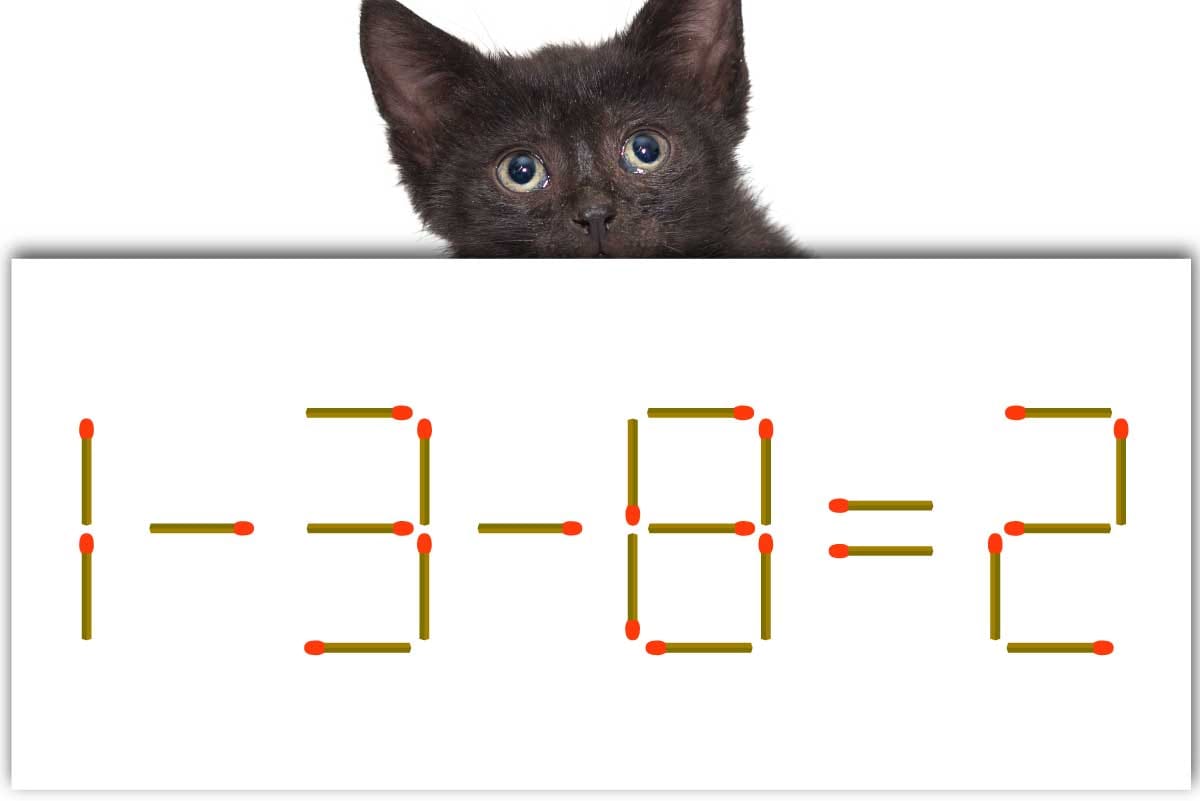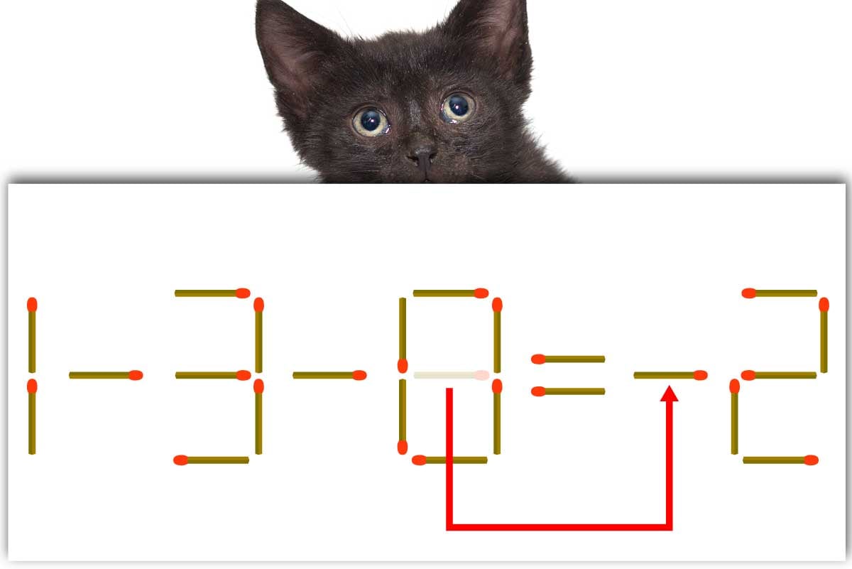「8」のマッチ棒を1本、「=」の後ろに移動させて「-」を作り、「1-3-0=-2」にする。※解答は複数ある場合があります。