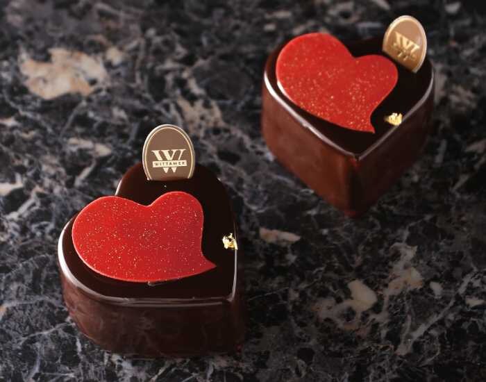 「クール・ショコラ」は、ミルクチョコレートムースをチョコレートムースで包み込んだ、濃厚な味わいが魅力。艶やかなショコラのグラサージュに真っ赤なハートのチョコレートを飾り、見た目も華やかに仕上げています。